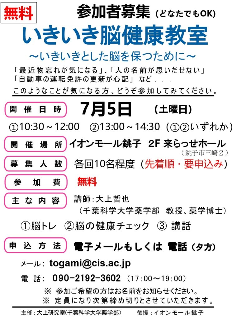 「いきいき脳健康教室(参加費無料)」を開催します
