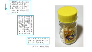 最近、ミニ模擬授業の題材として取り上げているのが抗ヒスタミン薬です。花粉症やアレルギー性鼻炎の治療に用いられるほか、かぜ薬にも含まれており、薬局やドラッグストアで処方箋なしに購入できる身近な薬です。